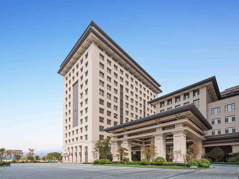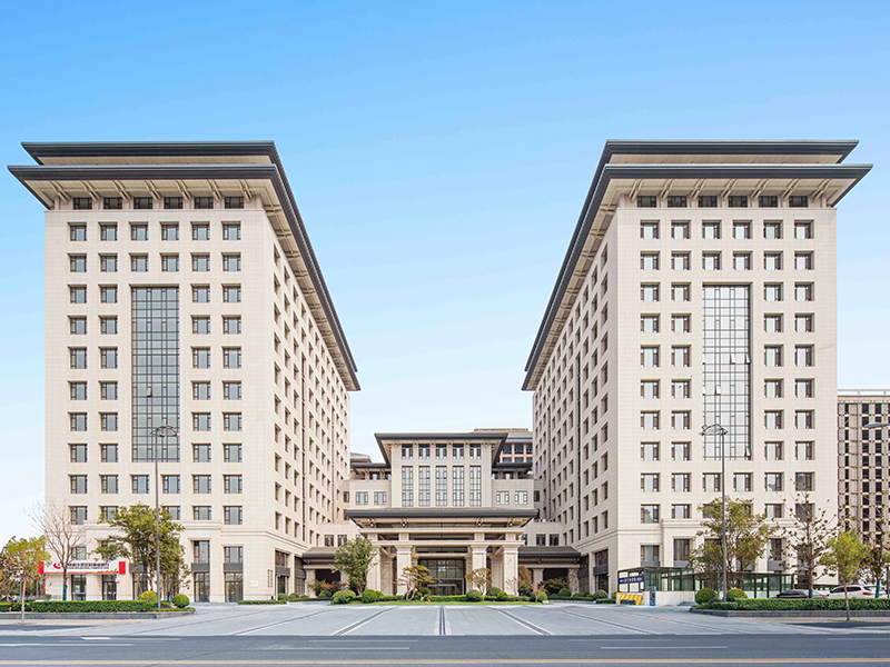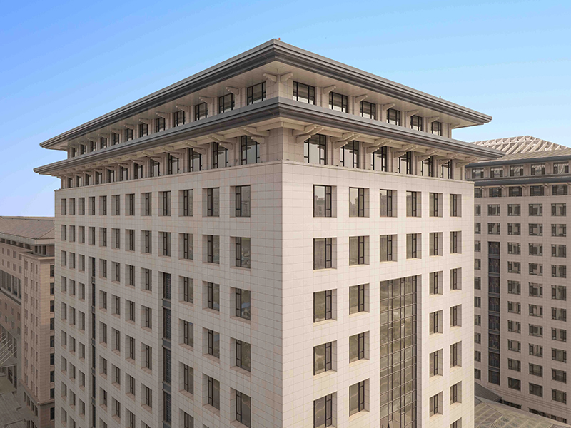 该项目各建筑主立面均严谨对称,立面构图采用古典的竖向三段式,适度的虚实对比弱化厚重的建筑体量,顶部采用重檐出挑深远延绵,呼应古宋遗风又不失时代感,契合开封市新宋风的城市设计指导原则。整体造型简洁大气,含蓄体现地域文化特色。立面全部采用干挂白麻花岗岩,仅在屋面檐口采用深灰色处理,色彩淡雅,独具端庄平和的儒雅气质。